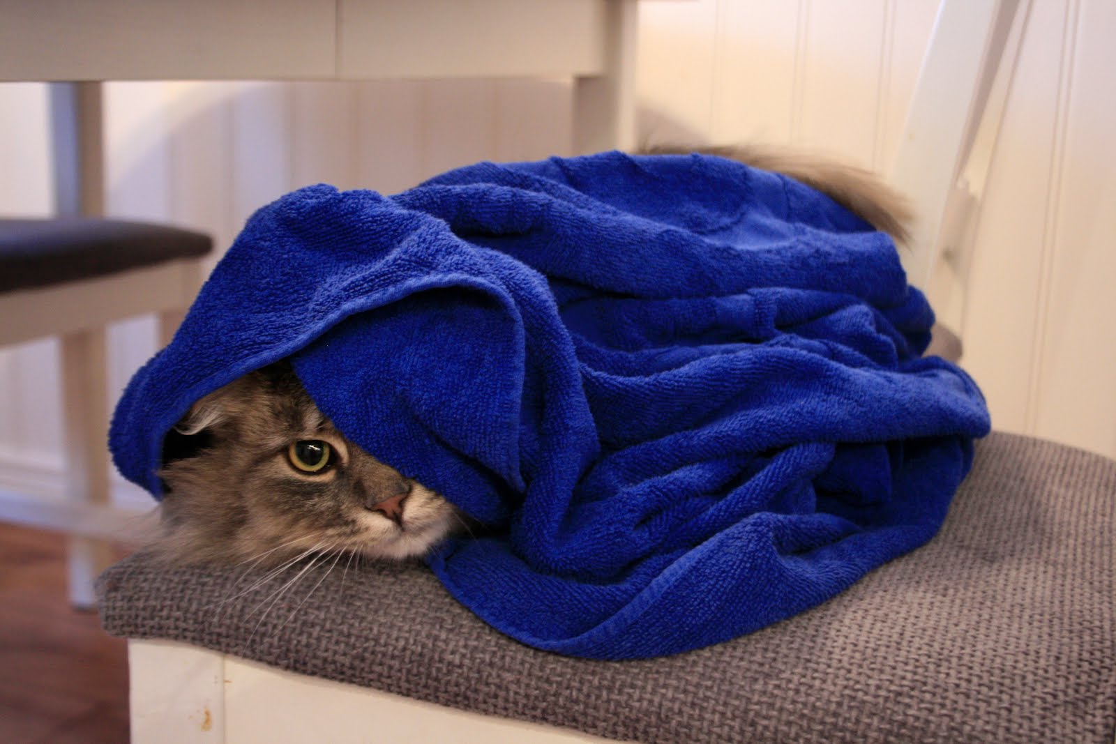 Så nu är Knas-katten nyduschad och leker kurragömma under handduken. Ett bra avslut på en hård arbetsdag.