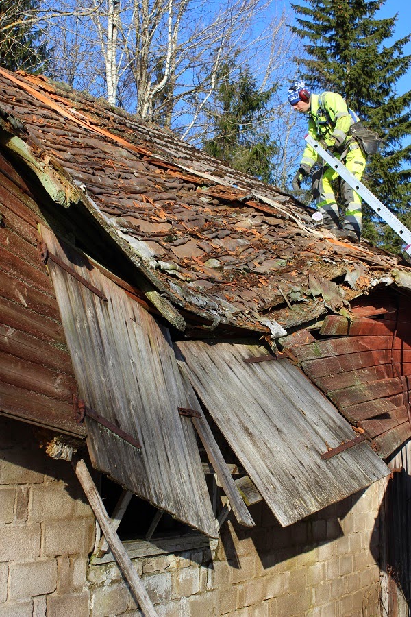 Men det var inte bara action. För oss med mer djupgående kulturellt intresse så fick vi beskåda hur det undanflyttade teglet blottade ett lager av björknäver – dåtidens takpapp, gissar jag och drabbas av lite hjärtesorg. Tänk allt arbete som ligger bakom. Tänk de människor som för 101 år sedan varsamt rev dessa näverbitar och placerade dem på taket. Tänk.