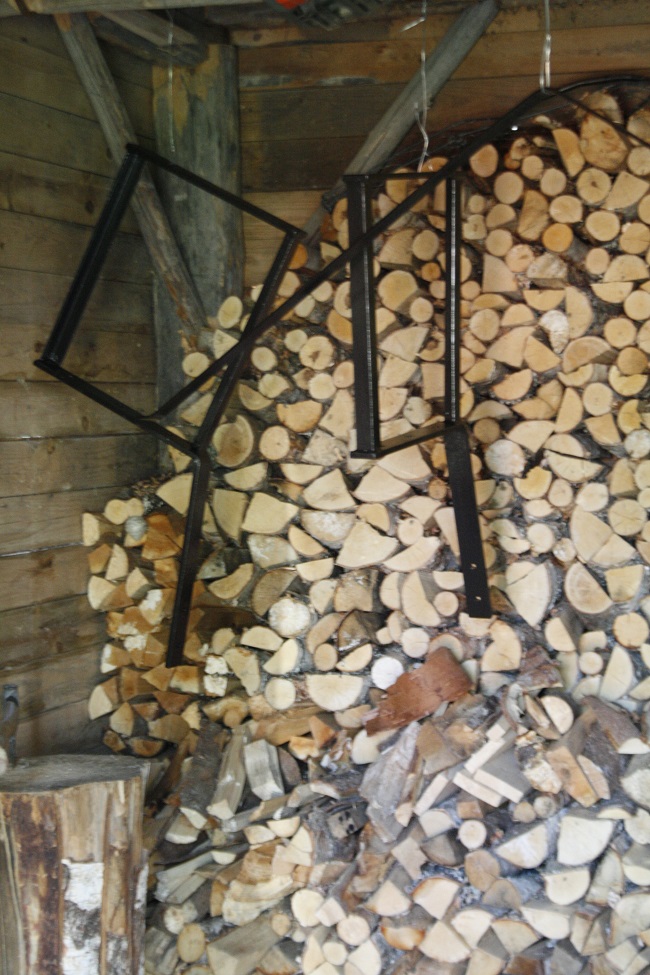 Öppnar man sedan dörren så möts man av denna konstinstallation. Svartmålad metall mot en bakgrund av ihärdigt kluven och staplad ved. En symbolik för det hårda jobb som vedhuggning innebär – eller?