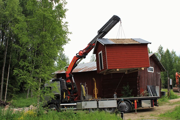 För det kom en lastbil. En stor lastbil, med ännu större kran och jättelånga stödben. Samtliga familjemedlemmar blev exalterade. Några för den imponerande fordonet, andra för arbetet som äntligen skulle bli utfört – flytt av den gamla vedboden.