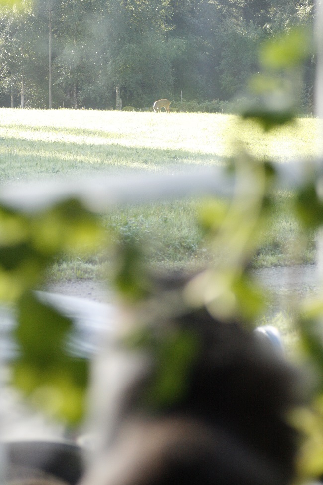 Jo då, där ute på åkern betar en råbock i godan ro. Frukostdags även för de andra varelserna i skogen. Och Knas-Katten, han är nog bara rädd om sina morötter.