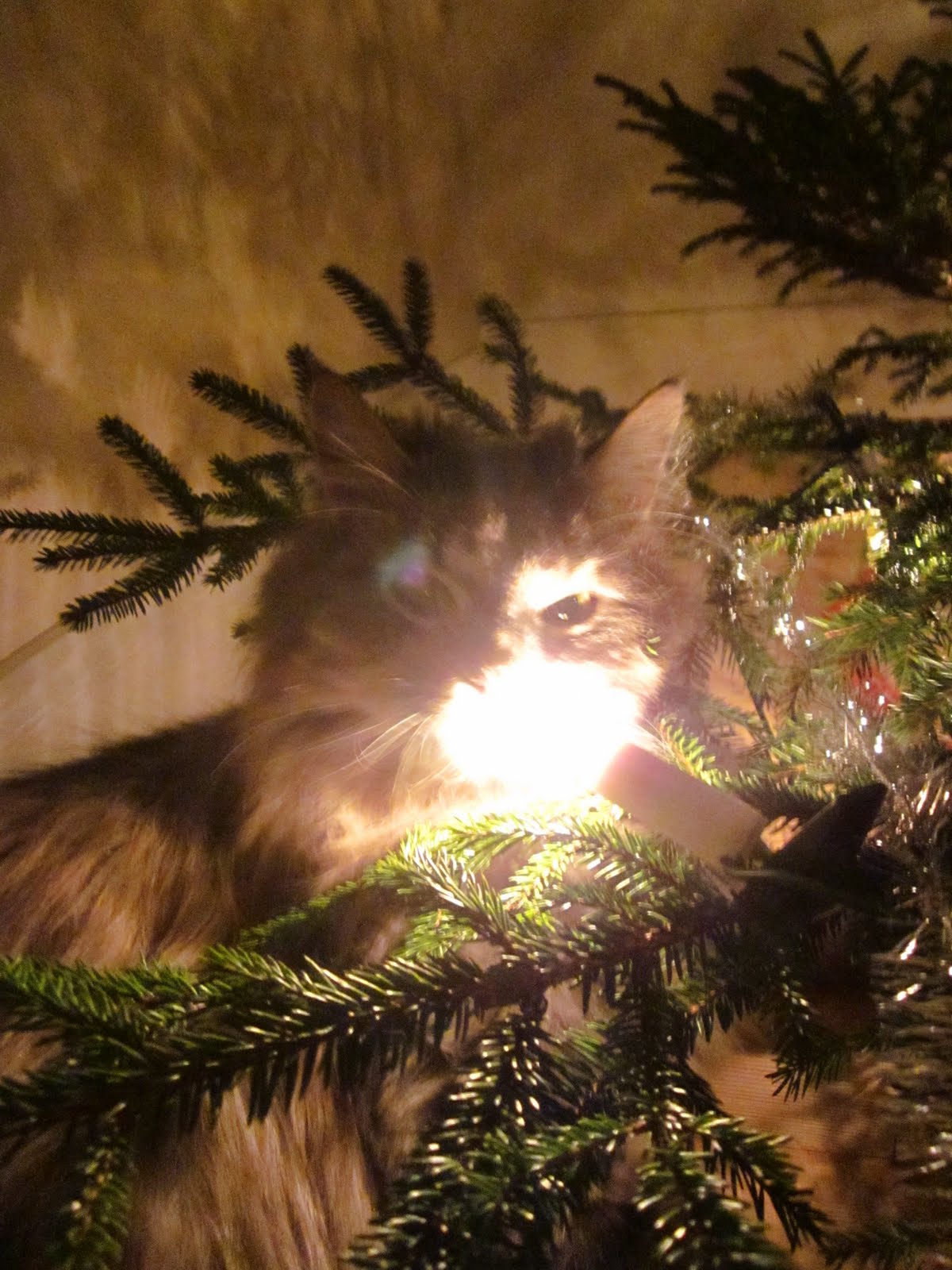 Så vi började hur som helst plocka ner kulorna och glittret. Men fram ur skuggorna smög sig då den nybildade enkattskonstelationen; Granens vänner. Rör inte min gran! Men trots den fredliga protestaktionen så åkte granen ut tillslut. Dock med vissa förhandlingar. Knas-katten fick behålla en julgranskula som minne och leksak till nästa år. För då kommer ju vinnaren i Julgran 2012 att med stolthet inta vinnarplatsen. Helt ovetande om granmarodörens förväntningar och platner…