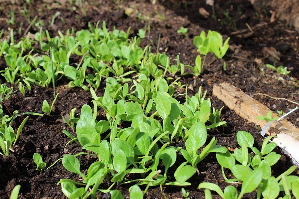 Det händer mycket i odlingarna. Lite för mycket för att jag ska hinna dokumentera allt så som jag vill. Främst så börjar spenaten, som jag sådde i slutet av februari, börja närma sig skörd. Vi är där och norpar ett litet krispigt blad nu och då, jag och min medhjälpare. Det är en speciell känsla, att knapra babyspenat i solskenet tillsammans.